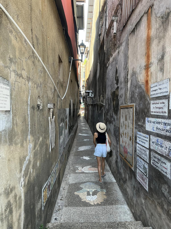 Somewhere in the heart of Chinatown in Terengganu this alley conveys the narrative of a young girl named Maya, serving as a cautionary tale urging us to refrain from consuming turtle eggs to ensure the survival and continued existence of these creatures. This poignant message has been inscribed on an aluminum container and affixed to the walls lining the alley.